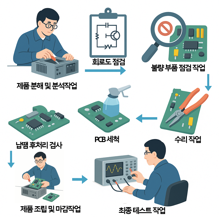 PCB 부품 단일소자 점검방식으로 회로도 없이 점검 및 수리가 가능합니다.
